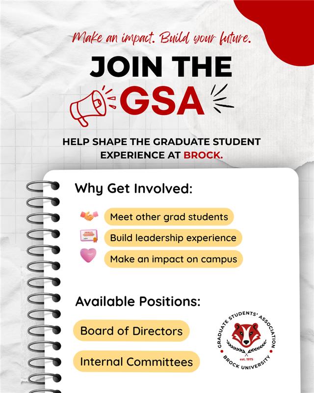 Step further into our space. brockgsa.ca is now your main web presence to learn about us, Brock University’s Graduate Students’ Association (GSA). We invite you to learn more about who we are, the services, resources and opportunities offered by the GSA and the greater Brock Community in our Annual 2025-26 GSA Student Handbook.